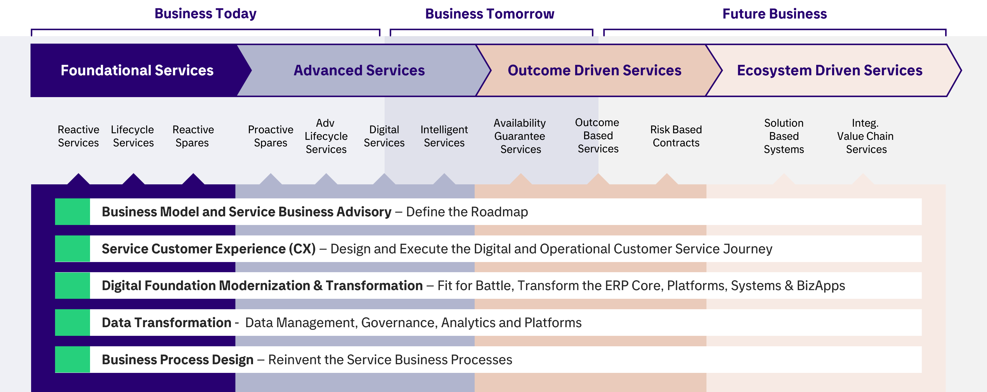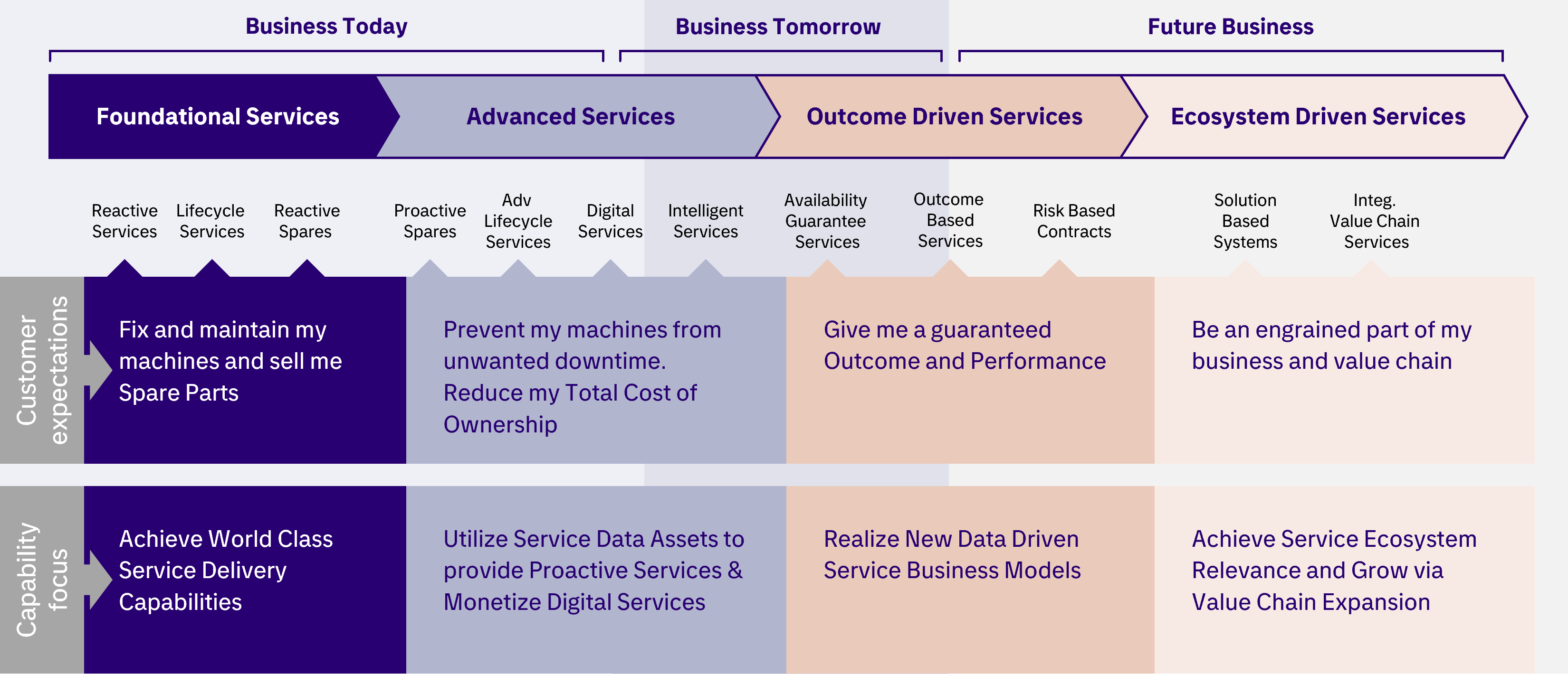 The above graphic shows one part of a very typical Servitization roadmap that we develop with our clients. It details a scenario of how you are likely to tap into service revenues today, tomorrow and in the future. Furthermore, it takes into account how your Service portfolio needs to adapt to changing customer expectations, and the key steps that need to be considered to enable the journey.