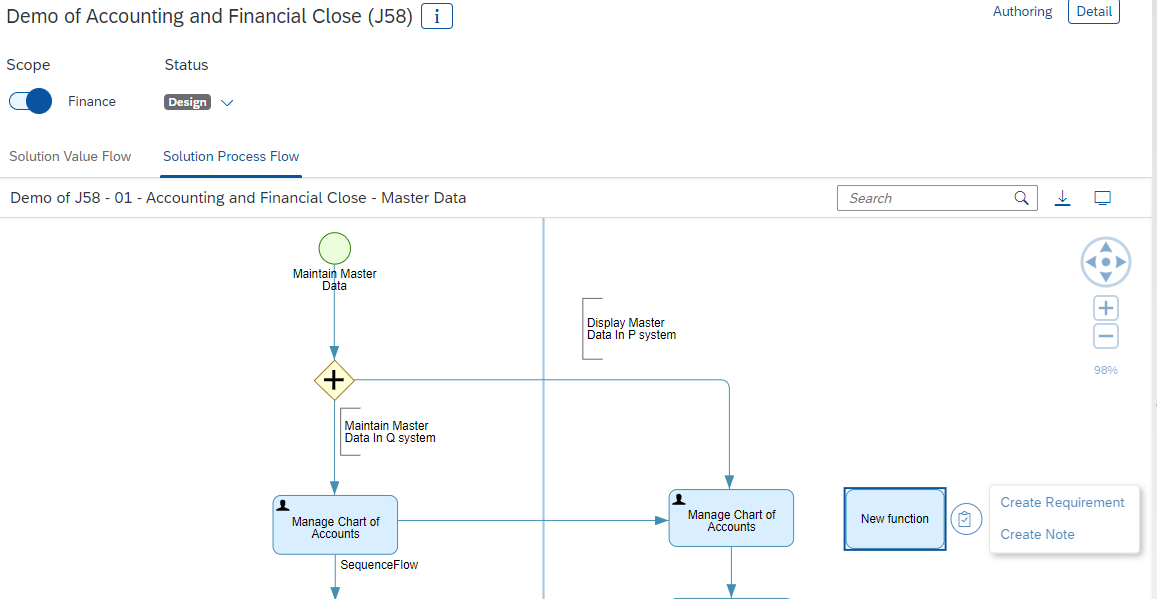 By clicking on a process name – such as Accounting and Financial close (J58) – you can see the solution value flow and the solution process flow. During Fit-to-Standard workshops, the processes are validated. If a BP process needs changes, the process diagrams can be copied into the custom process adapting changes to diagrams.
