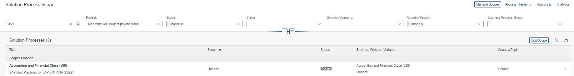 Scope setup can be handled by for example Business process experts and the Project Manager. In previous projects, we have created scopes according to SAP modules like SD, Master Data, Finance, Manufacturing, etc. Next, it is a good idea to put on Solution Scenarios in scopes. There are several Solution Scenarios that you can choose to put on. If you have, for example, a S/4HANA private cloud implementation project, then SAP Best Practices for SAP S/4HANA might be suitable for the scope. In most cases, custom specific processes are also required, in which case custom Solution Scenarios also need to be included in the scope.